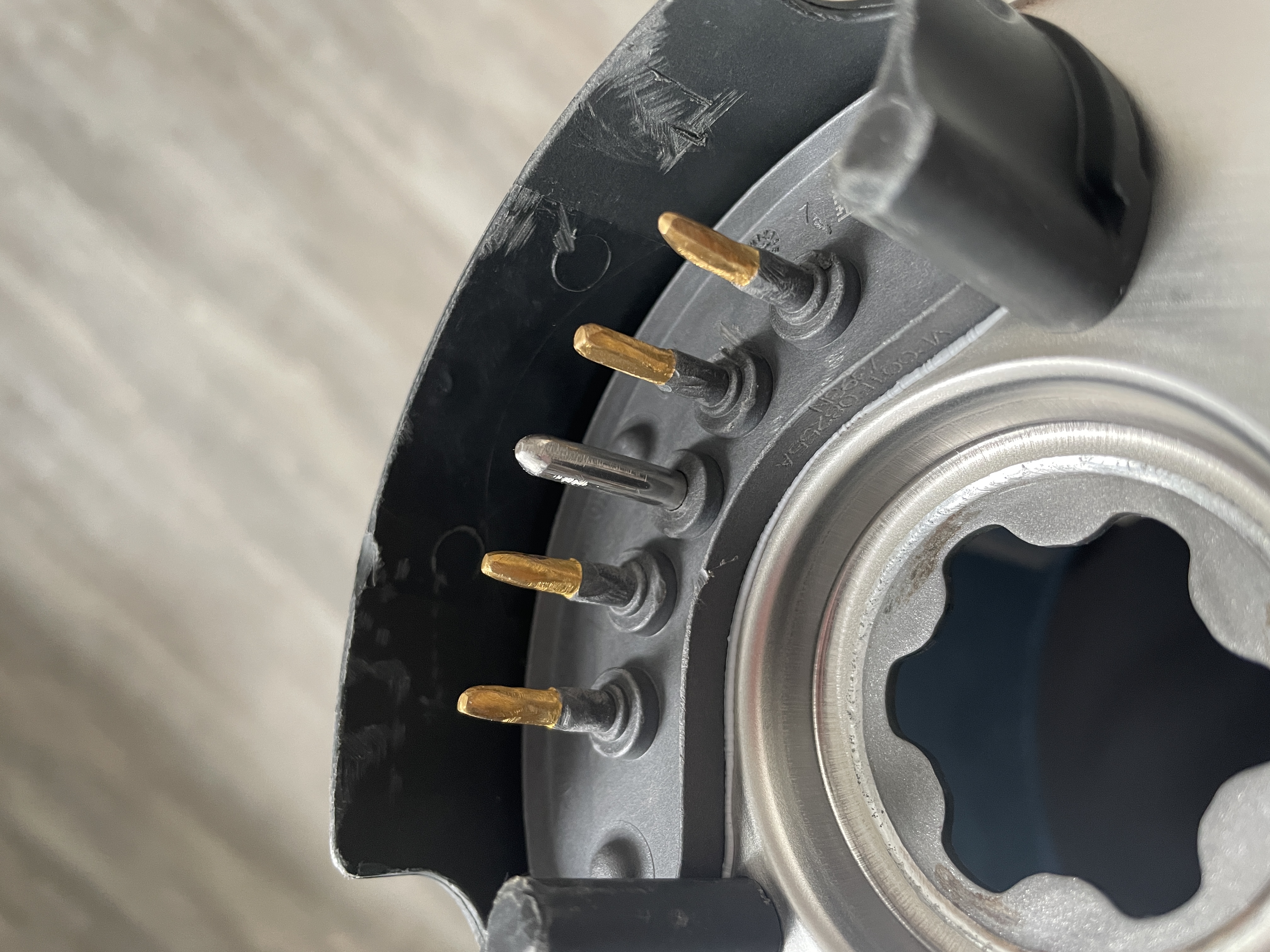 Daraufhin habe ich mir mal die Kontakte unter dem Mixtopf genauer angeschaut. Diese waren total rau. Da war der Fehler! Normalerweise sind die goldenen Stifte unter dem Thermomix glatt und glänzend. Aber hier waren sie rau. Wahrscheinlich wurde der Topf zu oft in die Spülmaschine gestellt. Offiziell ist der Thermomix spülmaschinenfest, aber trotzdem kam es zu diesem Fehler. Ich bin kein Chemiker, aber die Stifte sind wahrscheinlich durch die Spülmaschine oxidiert. Normalerweise sind sie mit dieser kleinen Goldschicht überzogen, damit sie besser leiten, aber genau das konnten sie durch die Rauheit nicht mehr tun.